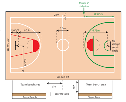 Dan lapangan permainan bola basket adalah persegi panjang dengan ukuran panjang lapangan yaitu 26 meter serta lebar lapangan yaitu 14 meter. Tiga buah lingkaran yang terdapat di dalam lapangan basket memiliki panjang jari-jari yaitu 1,80 meter.